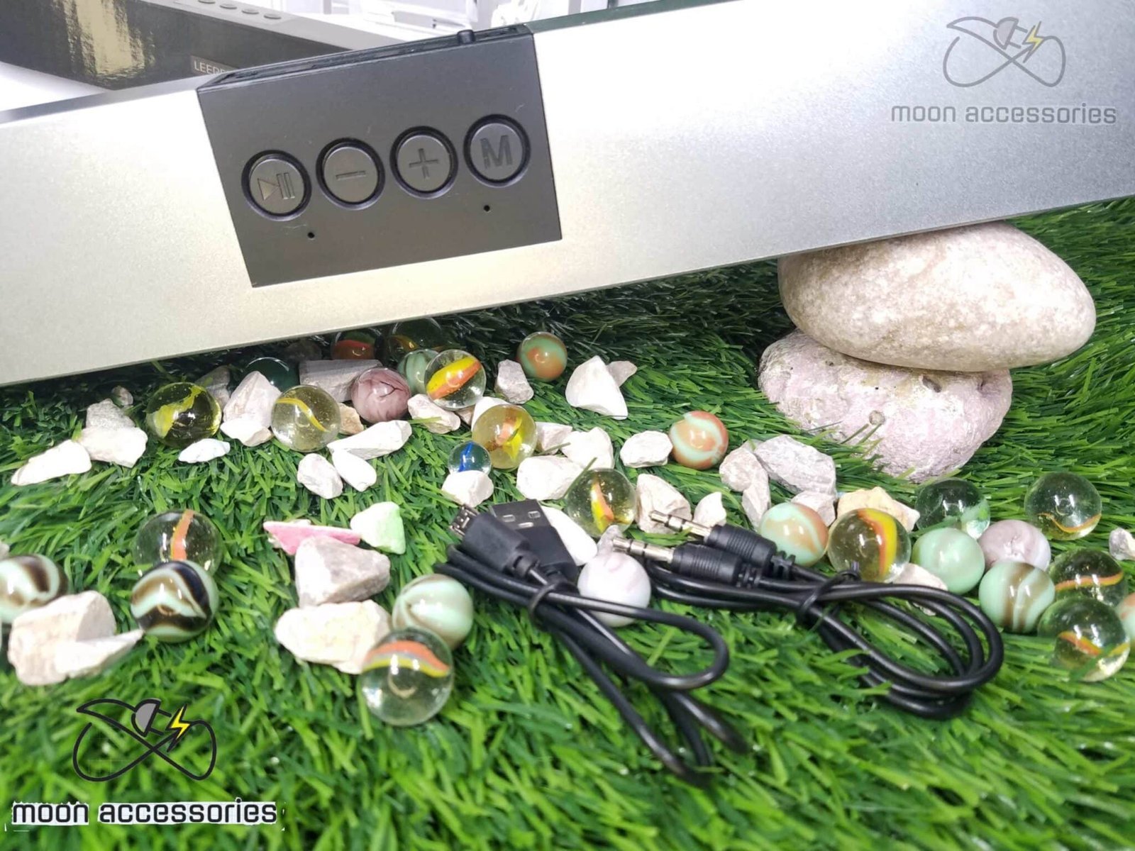 Includes USB charge cable and audio cable